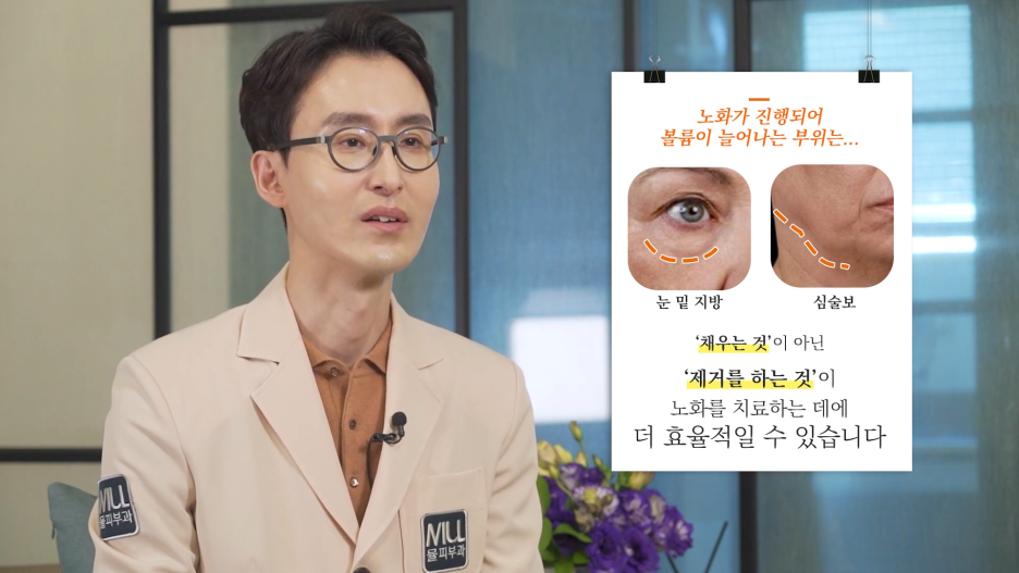 반대로 눈밑 지방이나 심술보처럼 볼륨이 늘어나고 처져서 튀어나온 부위가 공존합니다.